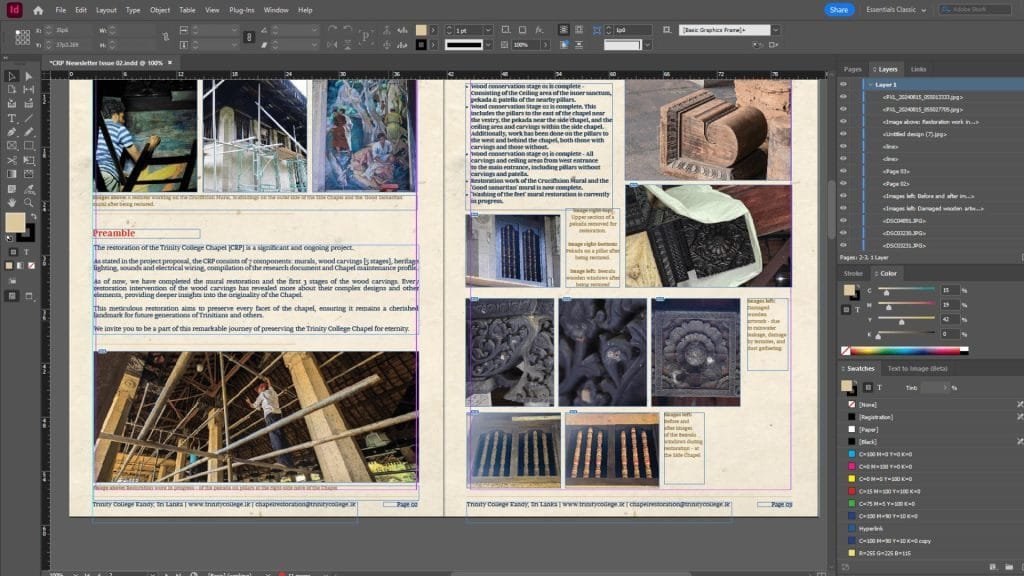One of the most fulfilling aspects of my work as a designer is getting to collaborate on passion-driven projects—those that resonate deeply with me. A project that stands out and fills me with pride is the Chapel Restoration Project (CRP) newsletter I designed for Trinity College Kandy. As an alumnus and someone who holds the chapel close to my heart, this initiative allowed me to give back to a place that has shaped who I am. It truly was an honor to be a part of it!